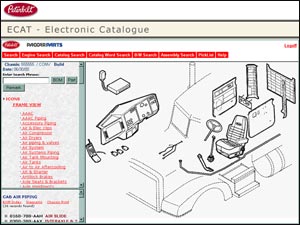 Fleet ECAT is a web-based catalog that enables you to access chassis records for your Peterbilt truck, providing smoother operation of your on-site maintenance department and specific definition of your parts requirements. The web-based system provides three search methods - word, bill of material or visual - to find the right part and part number. The system provides links to available wiring and air diagrams and is updated weekly. The result is a fast and easy way to find replacement parts and chassis-related information.